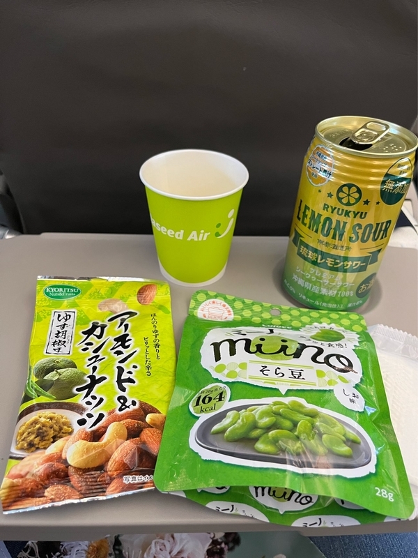 飛行機では、自前のお菓子をもちこんで、レモンサワーでお疲れさんの乾杯!