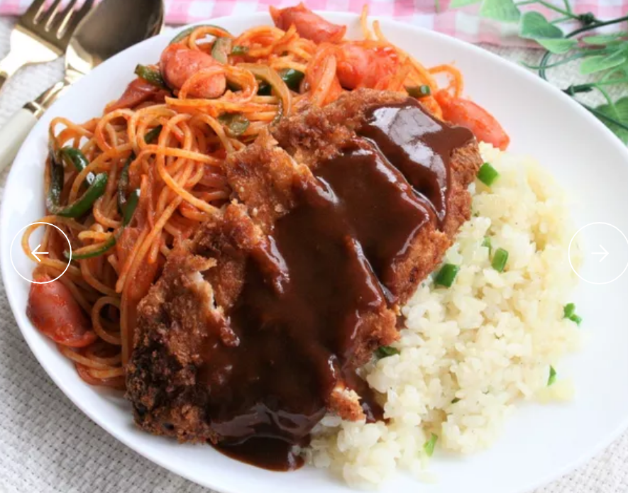 「トルコライス」とは、長崎県のご当地グルメで、ピラフ・スパゲッティ・ポークカツをワンプレートに盛り付けた料理のことです。ピラフとナポリタンスパゲッティの上に、デミグラスソースをかけたポークカツをのせるのが一般的なスタイル。